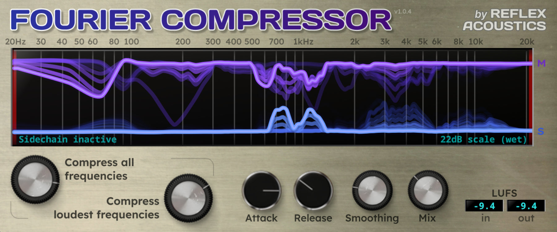 The Fourier Compressor from Reflex Acoustics uses an algorithm called the Fourier Transform to split your audio into 100 frequency bands, each of which is run through a mid-side compressor. You can optionally narrow which frequencies are processed, by dragging the red bars in the display.